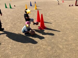 コーチのお話を、参加したこどもたちは真剣な眼差しでしっかりと聞いています。まずは、心と体をほぐす運動からスタートし、徐々にボールを使ったミニゲームへと進んでいきました。